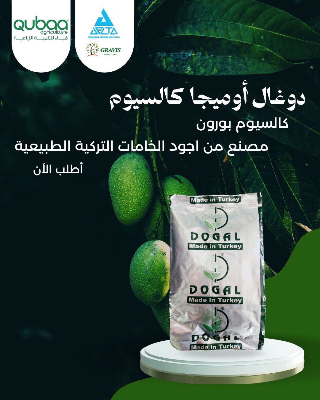 عقد أقوى – صلابة أعلى – جودة تصديرية مميزةالتركيب:كالسيوم % 18بورون % 2.5مصنّع من أجود الخامات الطبيعية التركية عالية النقاء.- أهــم مـمـيــزات دوغــال أومــيــجــا كــالــســيــوم• نسبة كالسيوم مرتفعة % 18 لدعم قوي لجدر الخلايا وزيادة الصلابة.• بورون %2.5 ضروري لنجاح التلقيح والعقد وتحسين انتقال الكالسيوم داخل النبات.• تركيبة متوازنة تمنع نقص الكالسيوم والبورون معاً.• يحسن العقد ويقلل تساقط الأزهار بشكل واضح.• يمنع تشقق وتعفن الطرف الزهري في الخضر والفاكهة.• يرفع جودة الثمار من حيث الصلابة، الحجم، والقدرة التخزينية.• آمن على النبات ولا يسبب حروق عند الالتزام بالمعدلات.• سهل الخلط مع معظم برامج الرش الورقي ومناسب للاستخدام المنتظم.• مثالي لمحاصيل التصدير الحساسة لنقص الكالسيوم والبورون.- دور دوغــال أومــيــجــا كــالــســيــوم في دعم النبات• دعم التزهير والعقد السليم.• تقوية جدر الخلايا وزيادة تحمل الثمار.• تحسين انتقال السكريات والعناصر الغذائية.• تقليل الأمراض الفسيولوجية المرتبطة بنقص الكالسيوم والبورون.• زيادة تجانس حجم وجودة المحصول.دوغـال أومــيــجــا كــالــســيــوم… توازن مثالي لعقد قوي وجودة أعلىكالسيوم + بورون بخامات تركية طبيعية لنتائج مضمونة.شركة: مجموعة الأنشطة الدولية (دلتا)- شركة قباء للتنمية الزراعية شريكك في النجاح